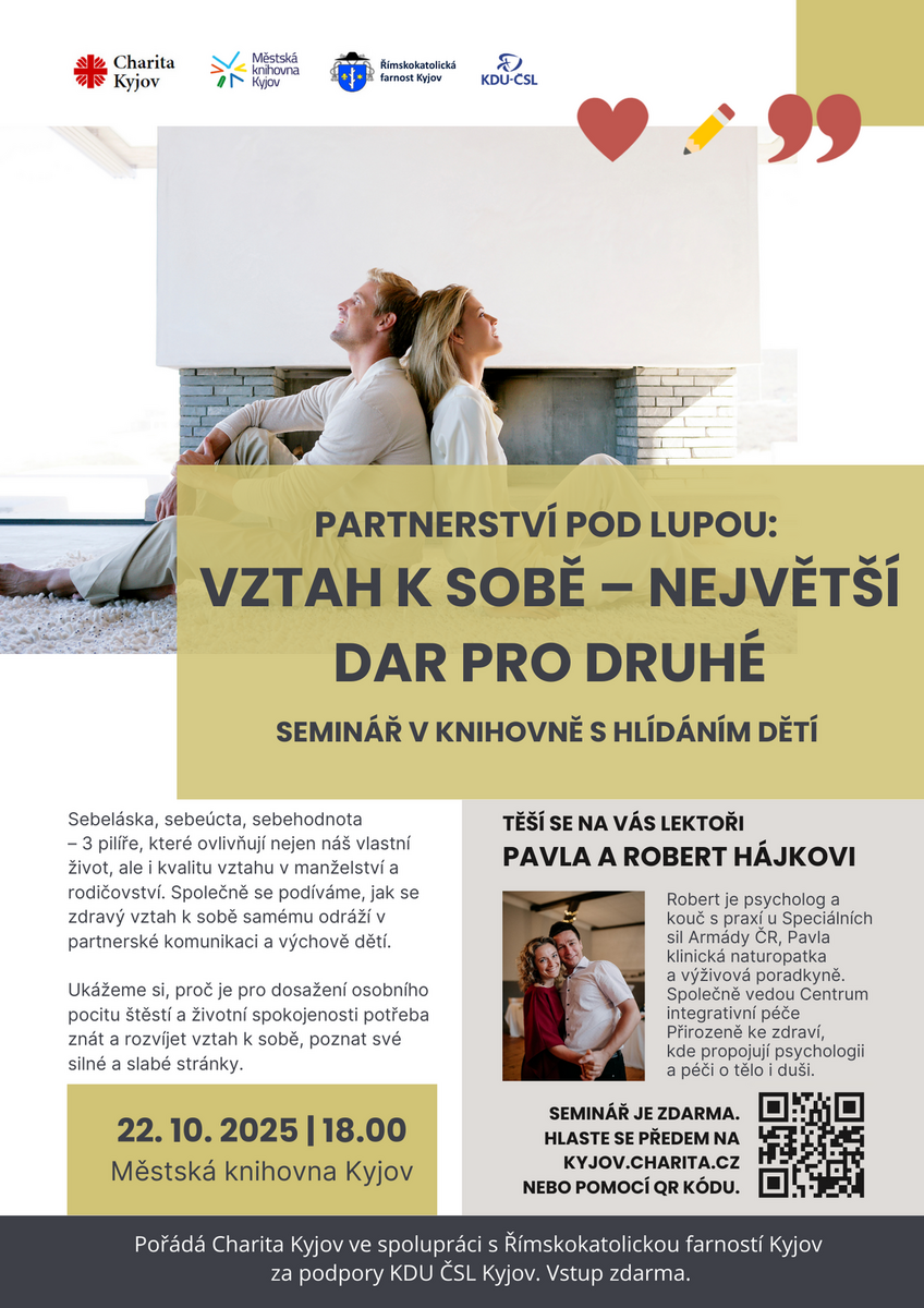 Zveme vás na seminář, který se uskuteční ve středu 22. 10. 2025 od 18.00 v prostorách Městské knihovny Kyjov. Vstup je zdarma a na akci bude zajištěno hlídání dětí. Prosíme vás o vyplnění této nezávazné přihlášky, která nám pomůže při organizaci akce – https://bit.ly/46mjmq7